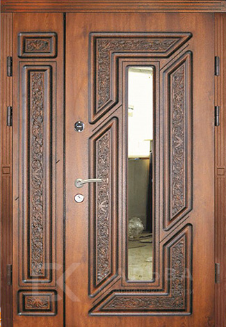 Фото «Металлическая двустворчатая дверь тёмная с остеклением и фрезеровкой №107»